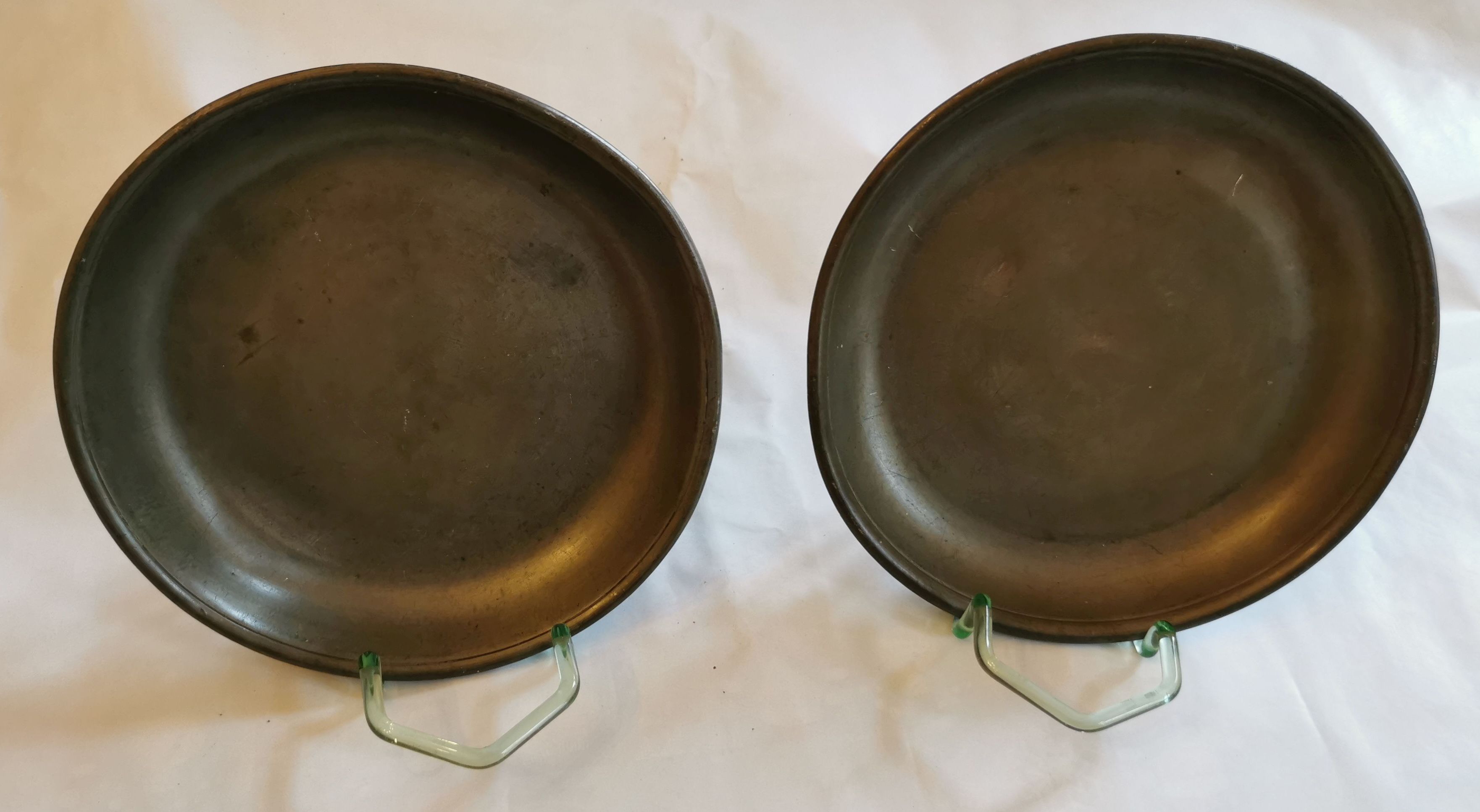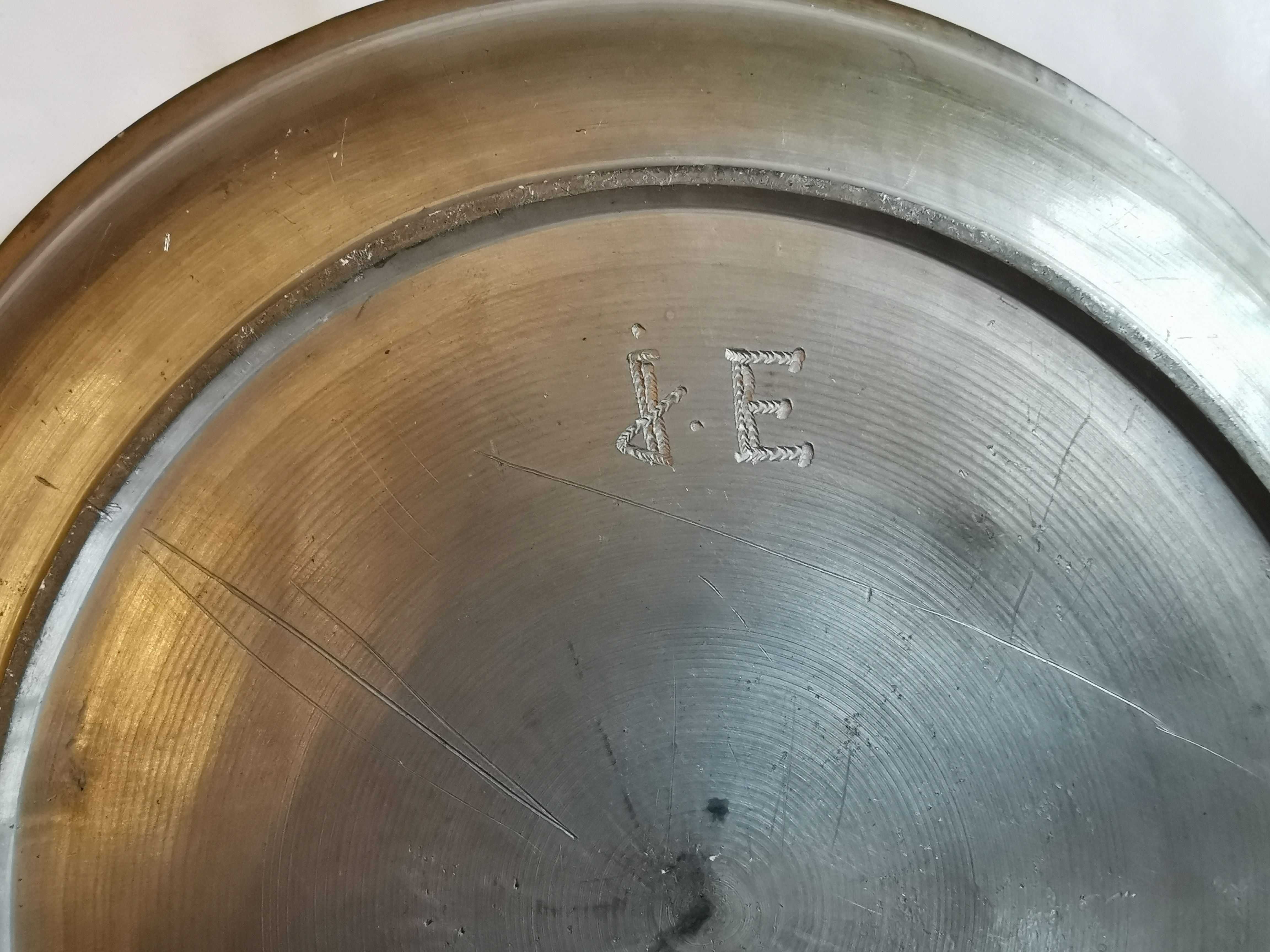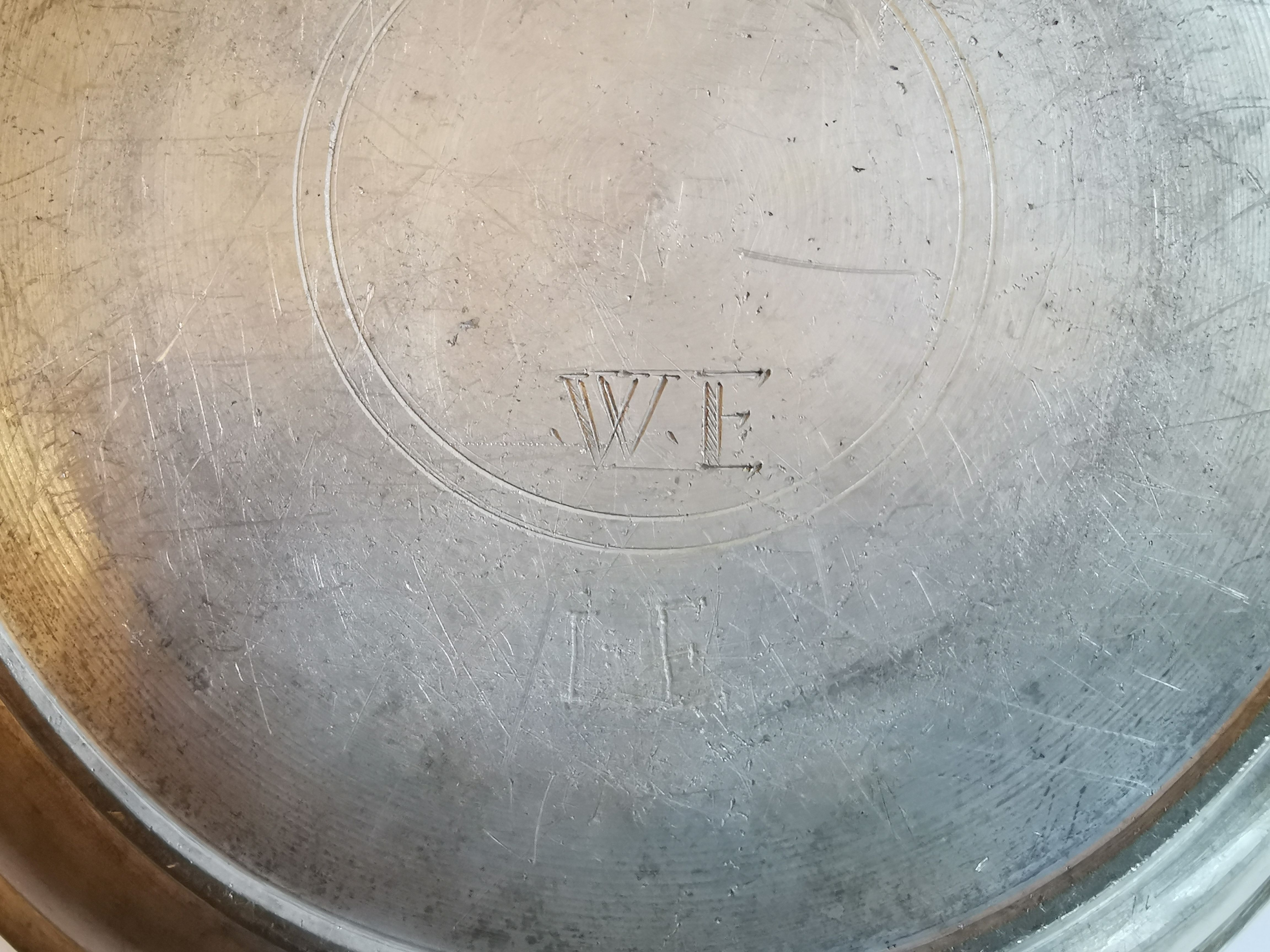 Zinnteller aus der Eiweiler Mühle meiner Vorfahren Engel | WE = Wilhelm Engel (1754-1837) | JE = Johann Engel (1788-18xx) |