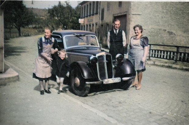 Rosa Rihm, Maria, Georg (Schorsch) und Frau Katharina Rihm mit ihrem Horch. Im Hintergrund das Haus von Jakob Jakob. (Kolonialwarengeschäft) |